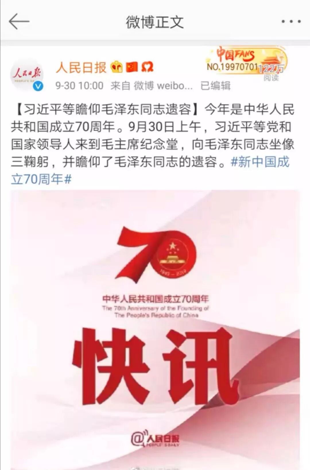 能够想象,尽管央视直播中没有出现一个镜头,尽管只是简单发布了几十个字,但这个消息还是会让很多人高兴的。因为毛主席是党和国家的缔造者,是人民英雄的领路人,在共产党建立新中国70大庆到来之际,在党和国家的领导人向人民英雄献花之前,能往前多走两步,去毛主席纪念堂鞠个躬,看他一眼,是完全应该的。符合民心民意,当然能为人民群众所欢迎。
