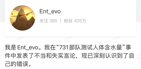 @Ent_evo 称自己在此事件中,未经多方查证资料就妄下结论,仅凭印象就否定了731人体含水量实验。为了纠正自己认识上的偏差,他还表示准备前往相关爱国主义教育基地进行学习。