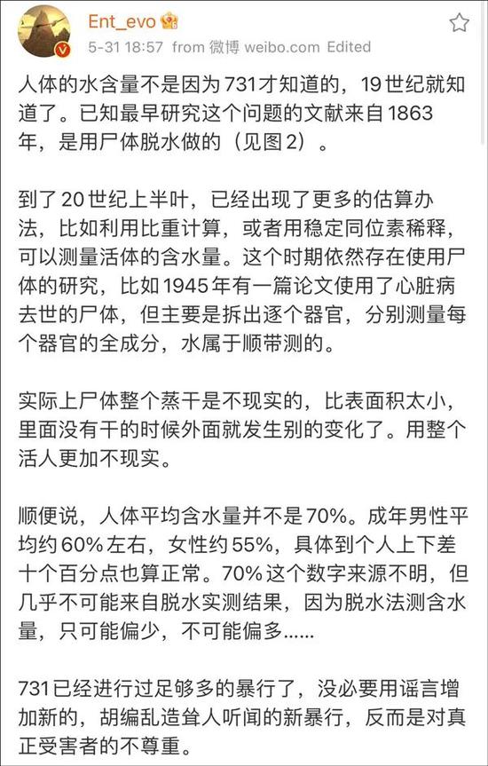 @Ent_evo 称自己在此事件中,未经多方查证资料就妄下结论,仅仅从实验设计有漏洞的角度,凭印象否定了日军731部队人体含水量实验。他还表示,经过三天闭关反思,自己已深刻认识到问题的严重性,对此次事件带来的影响负全部责任。