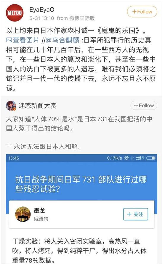 但这条博文更敷衍,@科学松鼠会 当时转发了一则与涉事博文毫不相关的内容,再承认5月31晚官博转发的日军731部队相关博文确实有不当之处,表示将引以为戒。如果不知道具体发生了什么,它这条博文多少让人看得丈二和尚摸不着头脑。