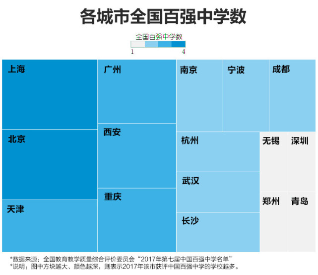 从2013年该项评估认定工作正式启动以来,十六城中已有10座城市实现了县域义务教育基本均衡100%全覆盖。值得注意的是,作为一线城市的广州、深圳在此项中的排名均不靠前。杭州作为浙江省的省会,在义务教育发展的均衡程度上却不及宁波,在十六城排名中为倒数第三。此外,郑州、重庆和西安也尚未完成义务教育基本均衡覆盖。 义务教育之后的高中教育同样重要,我们找到了全国教育教学质量综合评价委员会评定的“2017年全国百强中学”榜单,并分别计算了各城市的全国百强中学数量。