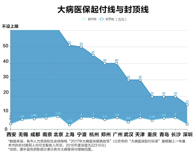 * 挂号、取药等候时间一般不超过15分钟 * 单个病人的问诊时间为3到6分钟 原国家卫计委主任李斌曾公开表示我国优质医疗资源当前存在总量相对不足、分布不均衡的问题,后者在数据上得到了展示。北京以58家的数量占据三甲医院数的榜首,其数值是榜尾(深圳)数值的8倍多。上海和广州在三甲医院数上表现突出。不过,当北上广的医院均摊给他们的常住人口,数量就并不多了——这还没有算上来自全国各地求医者。 在新一线城市中,天津和武汉分别以55家和45家三甲医院排名第二和第三,其中武汉每万人拥有的三甲医院数量在本榜单中最多。青岛每万人拥有0.04家三甲医院,这说明当地居民享受优质医疗服务相对更容易。 与城市的优质医疗服务水平挂钩的还有城市大病医保报销范围。 今年2月,国家癌症中心公布了中国最新癌症数据。报告显示,我国平均每天超过1万人被确诊为癌症,每分钟有7个人被确诊为癌症。“因病致贫”、“因病返贫”反映的是个人因患重大疾病陷入经济困境的情况,大病医保针对居民的高额医疗费用进行报销,它的起付线和封顶线影响着可报销的医疗费用数额。 我们从各个城市医疗报销政策上搜集了大病医保报销的起付线和封顶线,如下图所示: